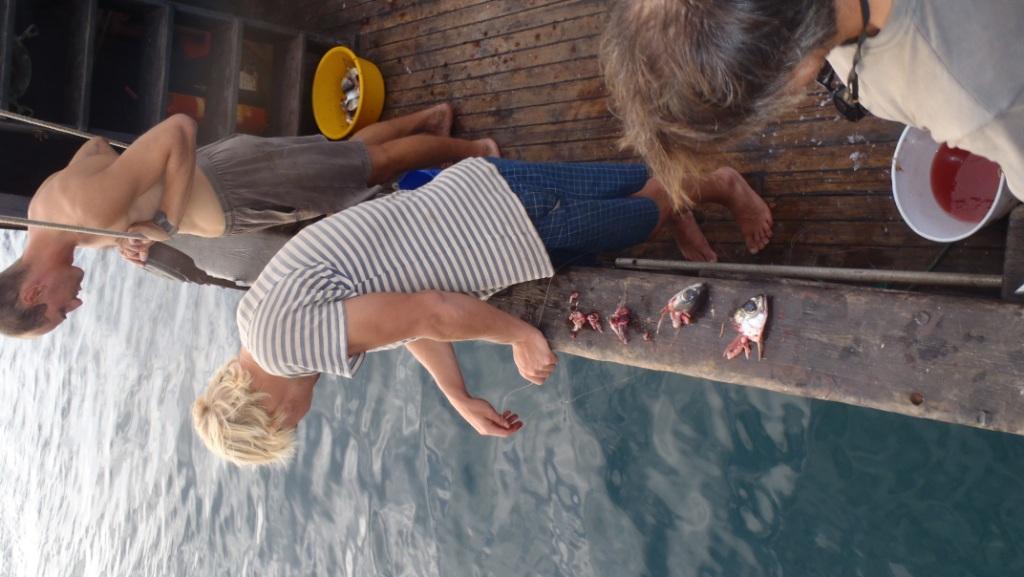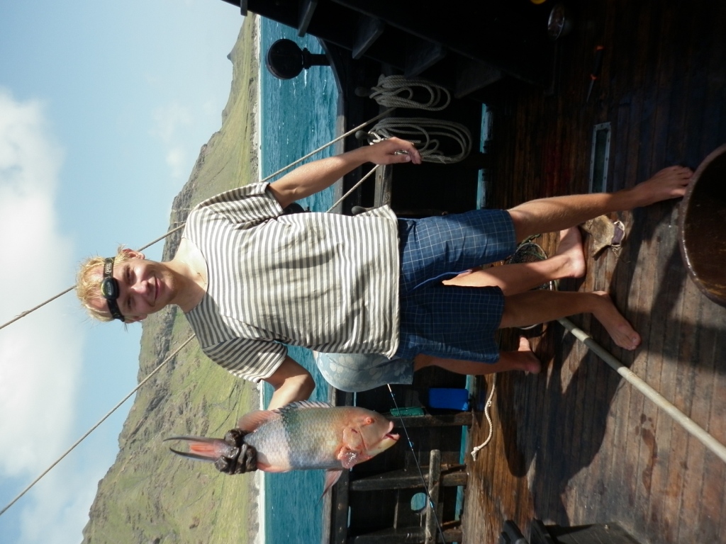 Vcera jsem mel narozeniny. Dostal jsem nový foták od rodicù a nejaký místní rum od ostatních. Taky nový kartácek na zuby od Petra. I pres moje protesty, že jsem si k mému starému vypestoval citovou vazbu a že mu minulý mesíc prestaly padat štetiny, ho Petr nemilosrdne vyhodil z okna. Narozeninový den byl zdánlive jako každý jiný- 35°ve stínu, hodina španelštiny, hodina astronavigace, pozorování chaoticky se hemžících cernochù na brehu i ve vode, vyšetrovaní zmizelé houbicky na nádobí atd.,presto se stalo neco neocekávaného. Navecer jsem se pokoušel neúspešne chytat ryby, cehož si všiml lovící rybár a jakoby vedel, že mám narozeniny, hodil po me se slovy „just take it“ asi 60cm tunáka (asi tunáka). Krásný dárek. Nacpal jsem si do pusy povidlovou buchtu (narozeninový dort) a mrsknul jsem ho na pánev. Chutnal fantasticky. Taky jsme ulovili na nastraženou sít pod lodí malého žralocka, ale pustili jsme ho zpátky do more.
