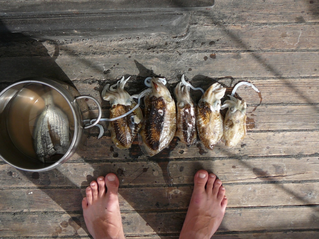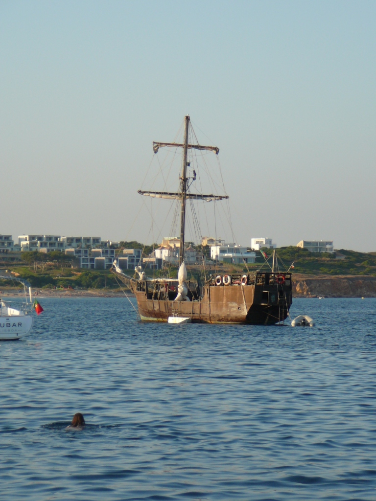 předevčírem po poledni jsem se vydal autostopem do města Faro, kam měla přijet Johanka výletnice. Stopovalo se celkem bez problémů. Lidé, právě opouštějící místní rastafestival, byli přívětiví a otevření. Svezli mě do Lagose, z kterého jsem se kabrioletem dostal na dálniční benzinovou stanici. Ten milý pán pokračoval dále vlastní cestou na sever a mě popřál hodně štěstí. Nejdřív jsem myslel, že na benzínce nikoho nechytnu, ovšem asi již na pátý/šestý pokus se mi podařilo přemluvit německou rodinku vracející se z dovolené. Měl jsem štěstí- jejich cesta byla shodná s tou mou, a tak jsem se někdy kolem půl páté ocitl na letišti ve Faru. Faro je město velké přibližně jako Pardubice a jeho pobřeží je močálového charakteru. Na tuisty, zmožené dlouhou cestou, žádné pláže nečekají. Přístavní město- marina obehnaná kamenným nábřežím s palmami, malá pevnost s kostelem a radnicí asi, auta, obchody se vším a tak. Přespali jsme u tratě v trávě a dopoledním vlakem jsme se vydali do Albufeiry- vlak nás však vyhodil asi 6 km od města, což jsme, teda Johanka, nevěděla a v příšerným pařáku jsme se vydali k moři. Byla to na hovno cesta. V městě- samej turista, pláž-mraky turistů, horko. Něco jsme poobědvali, vykoupali se a vydali se na stopa. Ještě předtím jsem se po měsíci vysprchoval ve sladký vodě a přemách prosolený džíny. Stopem jsme se celkem rychle dostali k Viktorce do Sagrese, kde nás přivítal zbytek posádky. Posílám fotku, na které je Johana plující k Viktorce pro člun, abychom na něm odvezli bagáž na loď. Já jí ze břehu navigoval. Taky sépie, které jsem v noci chytil- byli moc dobré.